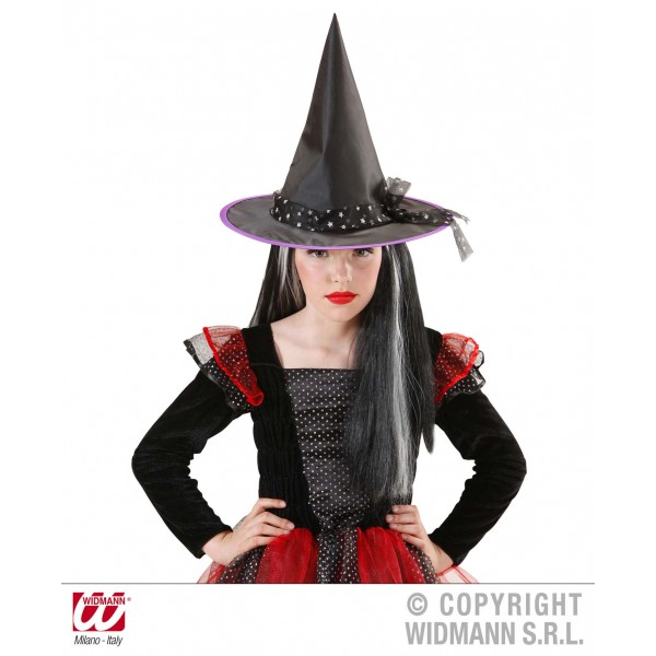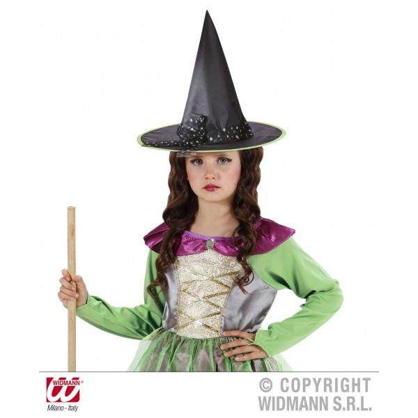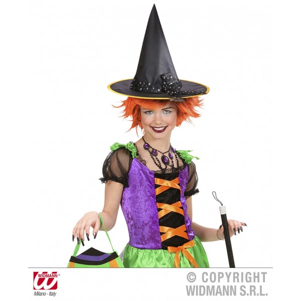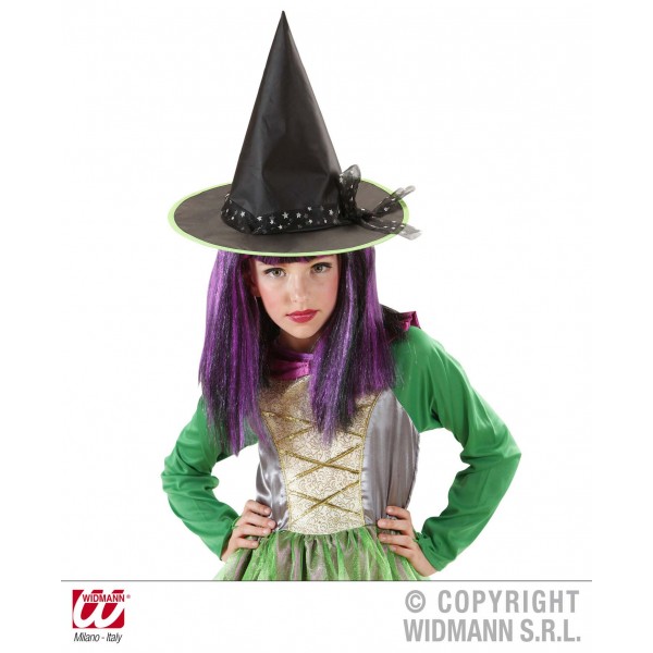 Palaria neagra de vrajitoare pentru copii include tiul cu stelute argintii si margine colorata, ce este disponibila in 3 culori: verde, portocaliu si mov.