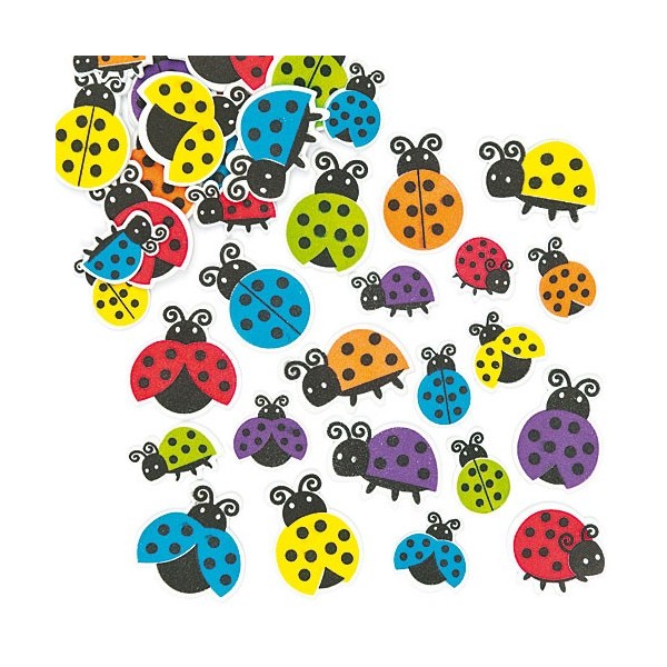 Setul include 100 buburuze autocolante in 6 culori asortate - rosu, galben, verde, portocaliu, violet si albastru si 5 modele.