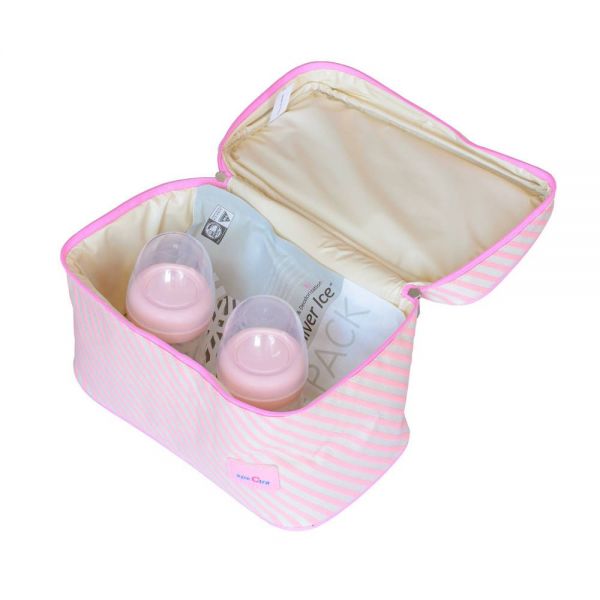 Aceasta geanta termoizolanta ingenioasa este perfecta pentru depozitarea si transportul biberoanelor cu lapte atunci cand mergi la plimbare, cand calatoresti sau cand afara este foarte cald. Interiorul gentii este bine izolat, iar punga cu gheata va permite depozitarea in siguranta a laptelui timp de aproximativ 24 de ore. Poti pastra in ea absolut orice, de la lapte matern pana la piureurile folosite la diversificare. Caracteristici Setul include: - 1 geanta termoizolanta cu maner si interior izolat - 1 pachet cu gheta sub forma de gel -refolosibil - 2 biberoane - fara BPA Greutate aprox.: 0.200 kg Dimensiuni: 25 x 15 x 15 cm Atentie! Componentele care intra in contact cu laptele trebuiesc sterilizate inainte de fiecare utilizare Laptele matern poate fi stocat 72 de ore in frigider si pana la 6 luni in congelator Laptele matern nu se incalzeste la microunde si nu se fierbe Folosirea componentelor la mai multe persoane poate duce la transmiterea diverselor boli.