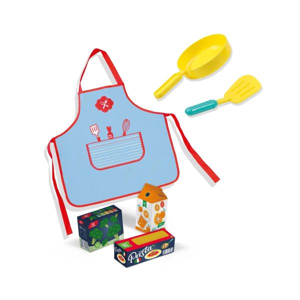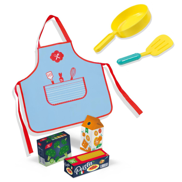Kitul contine nu doar un sort de bucatar, ci si accesorii practice pentru jocul de rol: tigaie, spatula si trei produse din magazin. Se poate combina cu celelalte produse din colectia de magazin si gatit pentru o joaca si mai creativa.