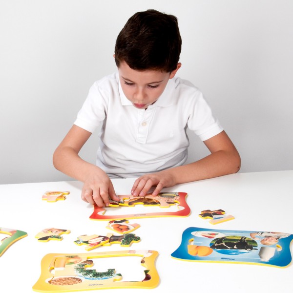 4 puzzle-uri concepute pentru a invata copii despre alimentele de baza si originea lor, fie ca este vorba de cele animale sau vegetale.