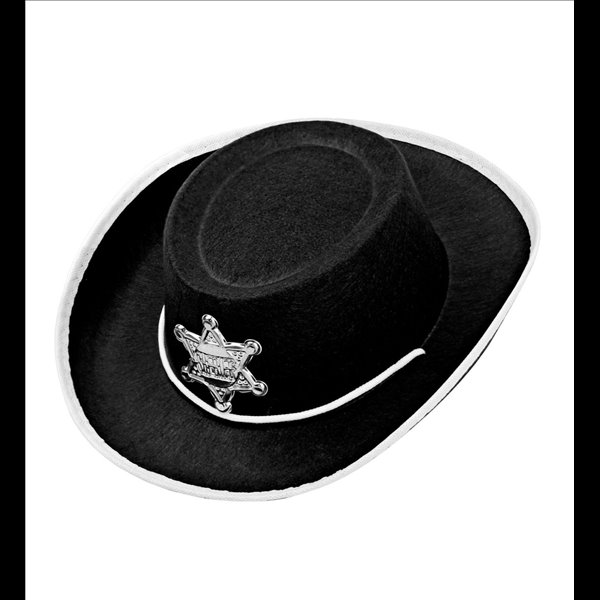 Palarie Cowboy Copii Neagra din fetru cu insigna aplicata si snur de prins sub barbie. Circumferinta produs 53 cm.