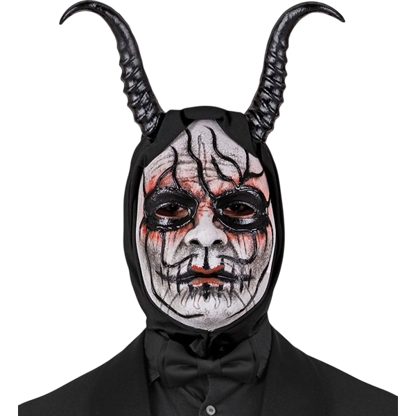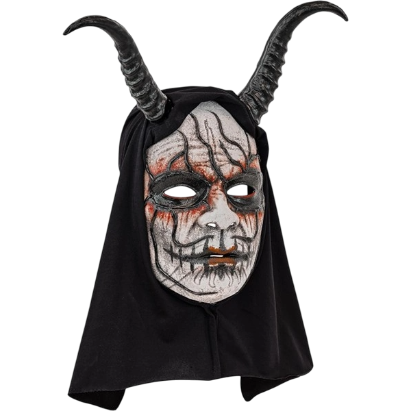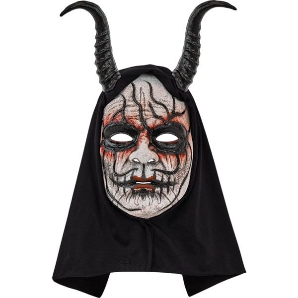 Masca Demon Barbat din plastic dur cu aspect creepy, gluga neagra si coarne atasate.