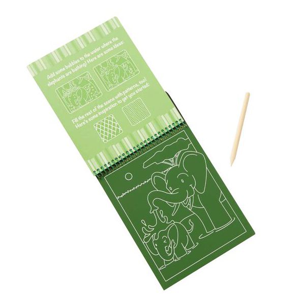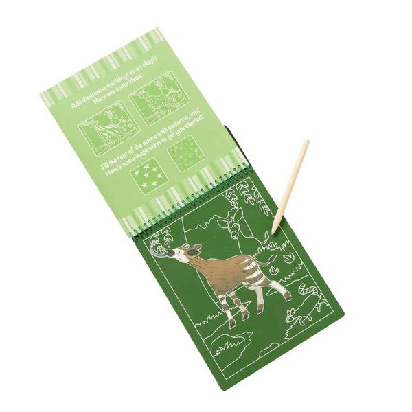 Utilizați stiloul din lemn inclus pentru a zgâria suprafața, a gravura detaliile și a dezvălui 12 scene de safari cu elefanți, hipopotami, girafe, lei și multe altele.