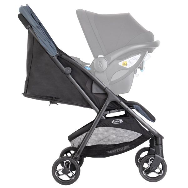 Caruciorul Graco Myavo poate fi transformat intr-un sistem de calatorie prin atasarea scoicii auto Graco SnugEssentials i-Size, impreuna cu adaptorii potriviti (se achizitioneaza separat).
