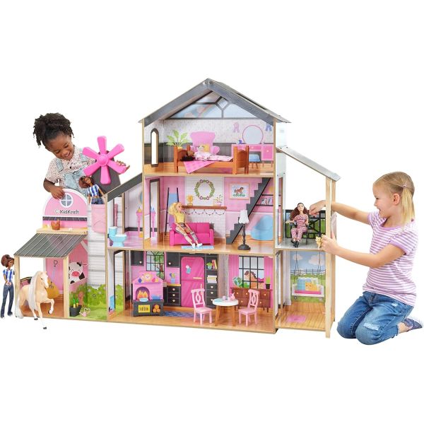 Casa de papusi din lemn cu trei etaje este conectata la un siloz de cereale functional si la un hambar dragut pentru mai multe spatii de joaca, pentru a afla despre viata intr-o ferma.