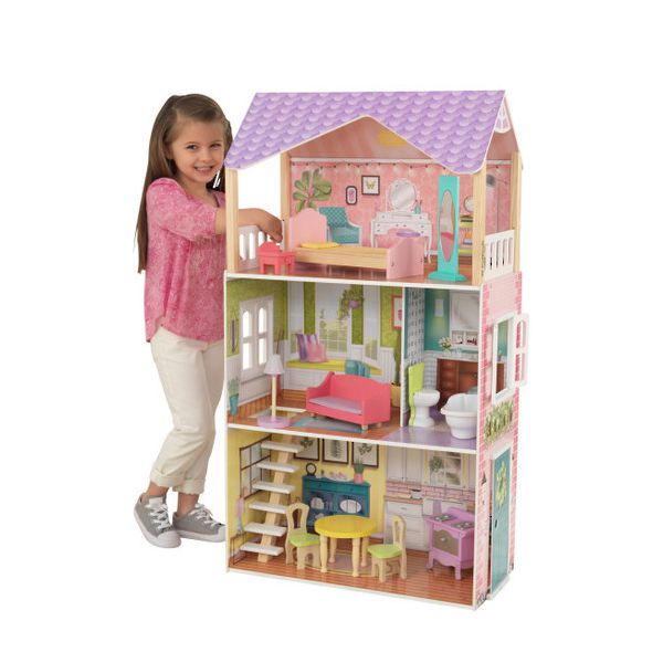 O casa incantatoare de papusi Kidcraft Poppy cu o inaltime pana la 4 picioare. Trei nivele si patru nivele care asigura spatiu pentru o multime de papusi.