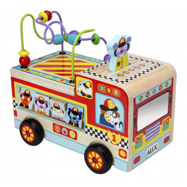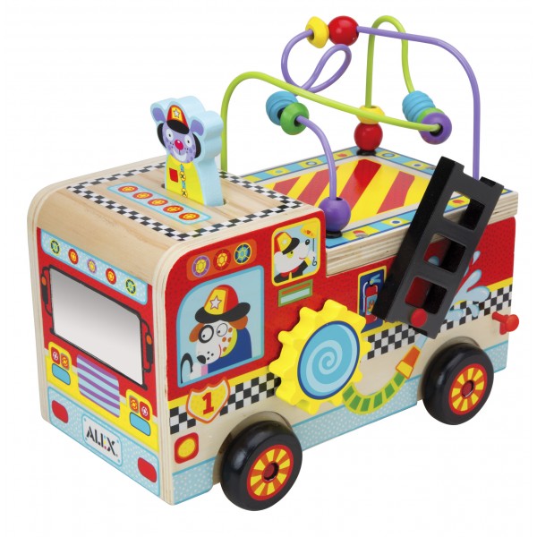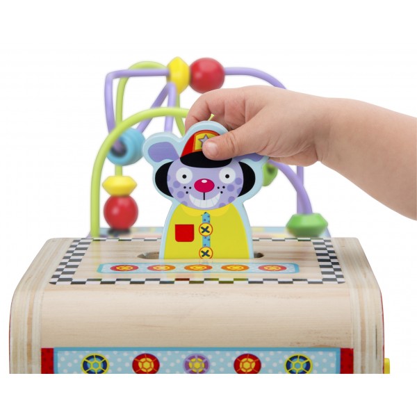 Masinuta este "dotata" cu 8 activitati repartizate pe fiecare parte: roti care se invart, labirint cu bile, scara mobila, oglinda, roata dintata, piese care se rotesc, figurina mobila.