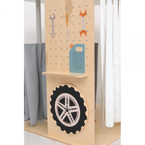 - In partea dreapta este un atelier auto cu carlige pentru scule si un raft pentru alte accesorii.
