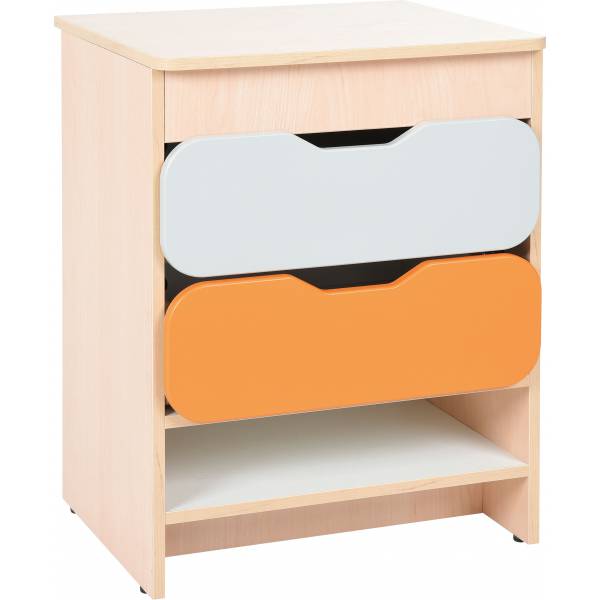 Dulap cu 2 sertare si un raft fabricat din lemn stratificat in ton de artar si alb cu grosime de 12 mm. Fronturile sunt realizate din MDF colorat.