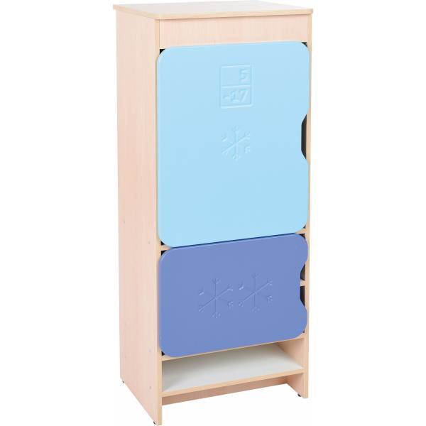 Frigider cu 5 rafturi in interior fabricat din lemn stratificat in ton de artar si alb cu grosime de 12 mm. Fronturile sunt realizate din MDF colorat.