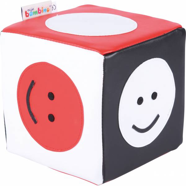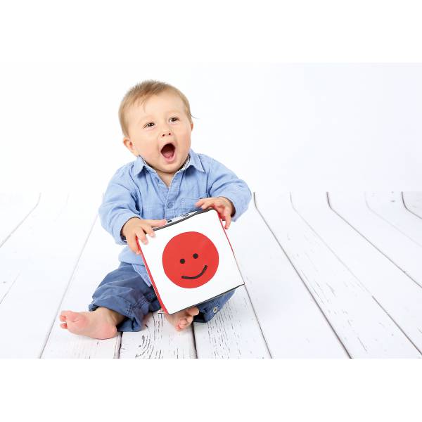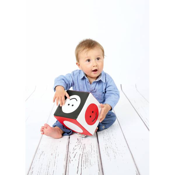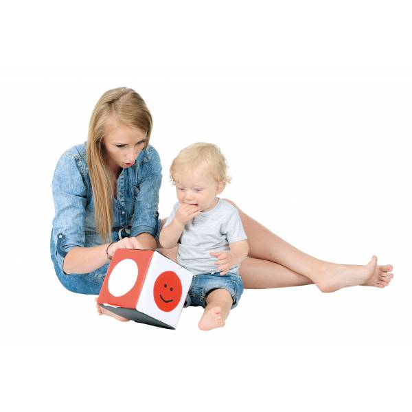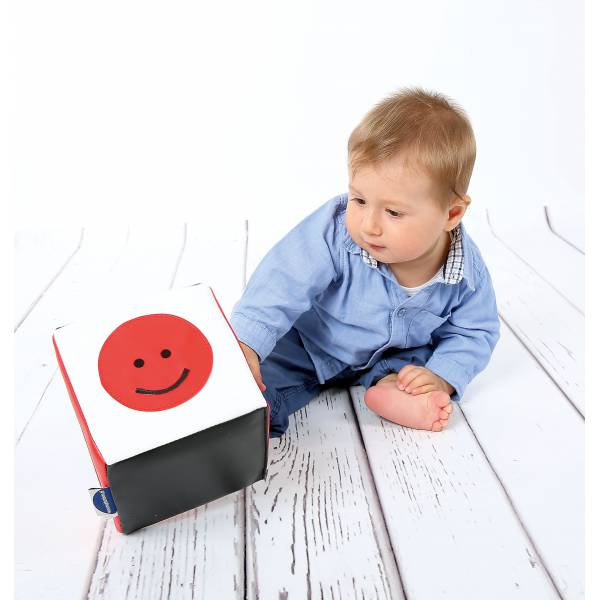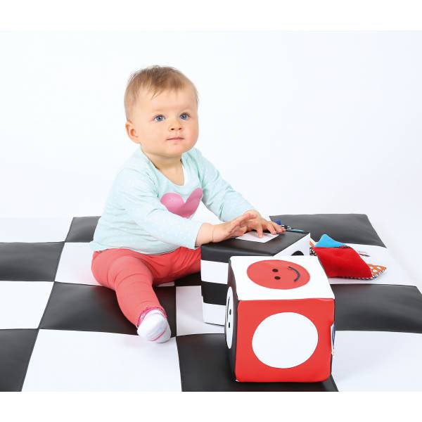 Cub senzorial in culorile alb, negru si rosu, cu modele si fete zambitoare imprimate pe ele.