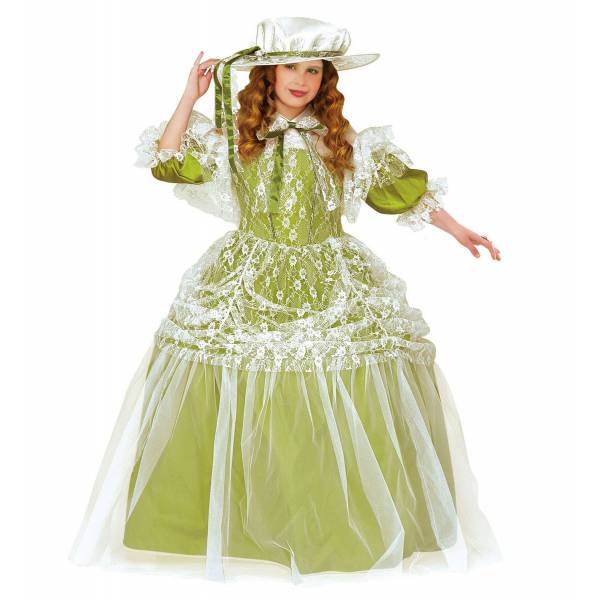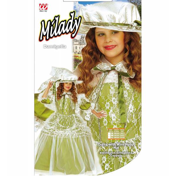 Costumul Milady include rochia cu crinolina si dantela aplicata alaturi de palaria asortata.