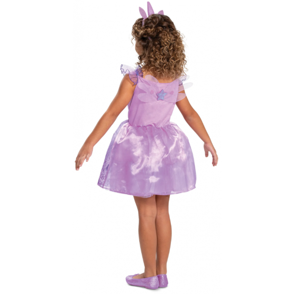 Costum Twilight Sparkle My Little Pony include rochia cu imaginea personajului imprimata, aripile din material detasabile si bentita.