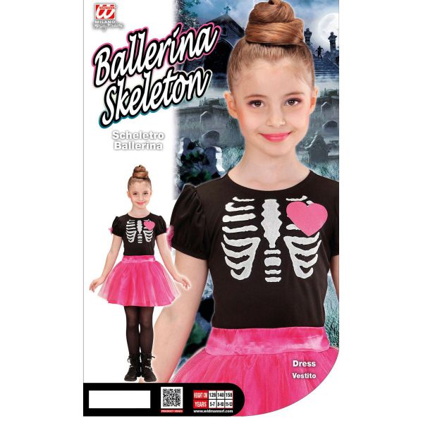 Costum Schelet Balerina Halloween include rochia cu jupa aplicata si imprimeuri pe partea din fata. Aceasta deghizare este disponibila pentru fetite in 4 categorii de varsta: 4-5 ani (116 cm inaltime), 5-7 ani (128 cm inaltime), 8-10 ani (140 cm inaltime) si 11-13 ani (158 cm inaltime).