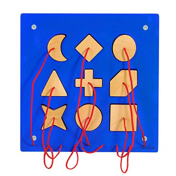 Placă albastră cu 9 piese de puzzle de diferite forme, atârnate de sfori. Piesele de puzzle sunt reținute în locurile corespunzătoare prin intermediul unei conexiuni cu magnet.