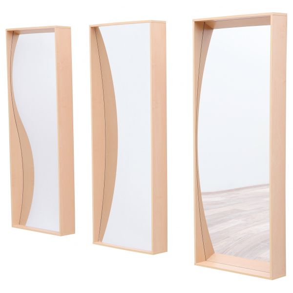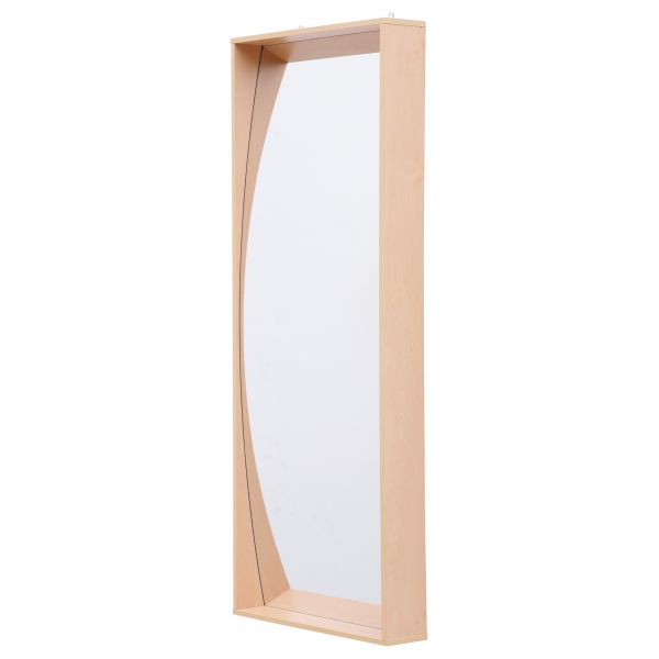 Oglinda acrilică rezistenta la spargere este plasată într-un cadru stabil din PAL pe ton de mesteacăn.