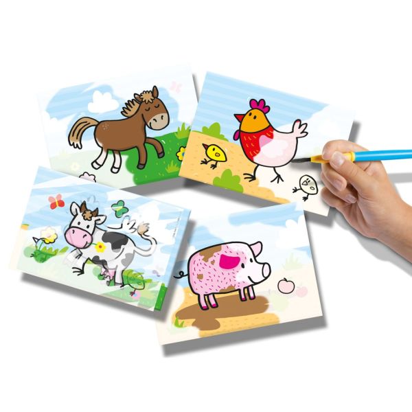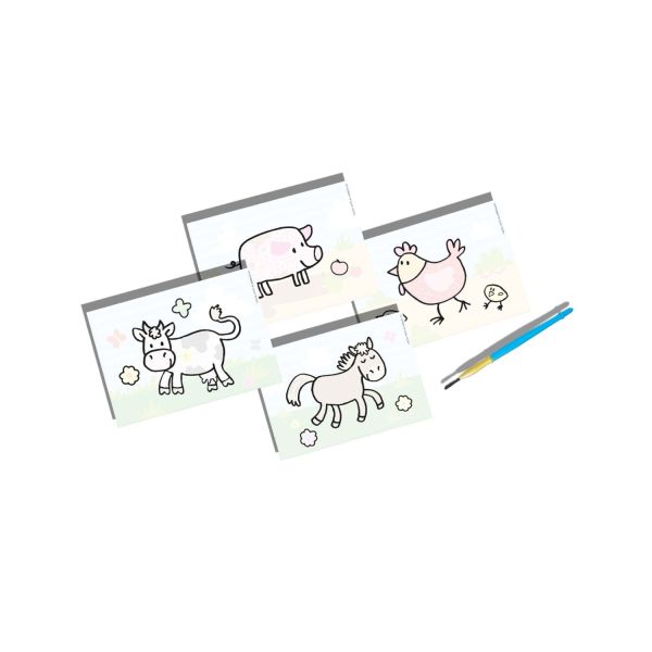 Contine: 4 carduri magice de colorat cu apa; 1 pensula.