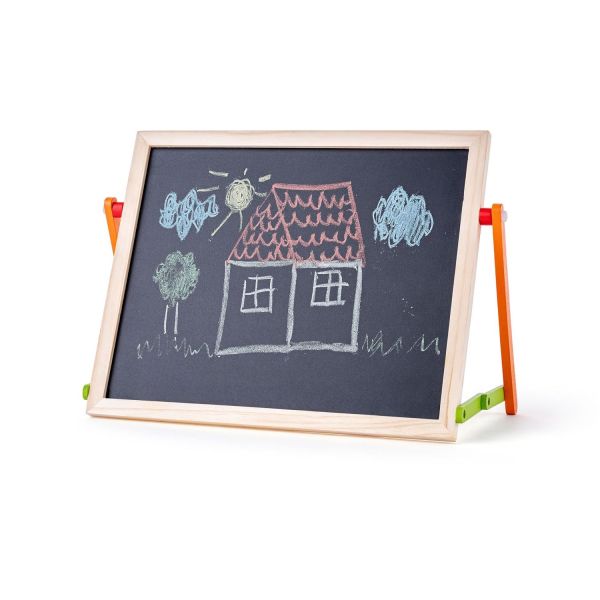 Tabla de masa cu doua fete. Pe o parte o suprafata neagra pentru scrierea cu creta, pe cealalta o suprafata magnetica alba pentru scrierea cu un marker.