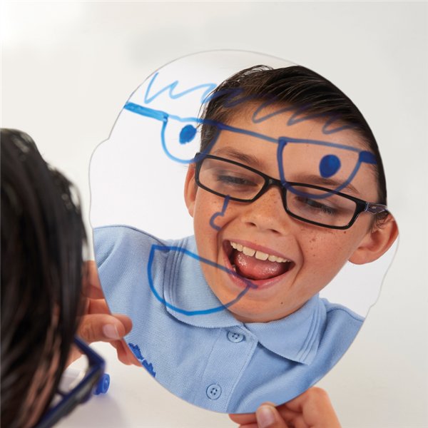 Copiii se pot observa, pot analiza expresiile faciale si pot desena pe suprafata oglinzii cu markere lavabile, transformand invatarea intr-o experienta creativa si personala.