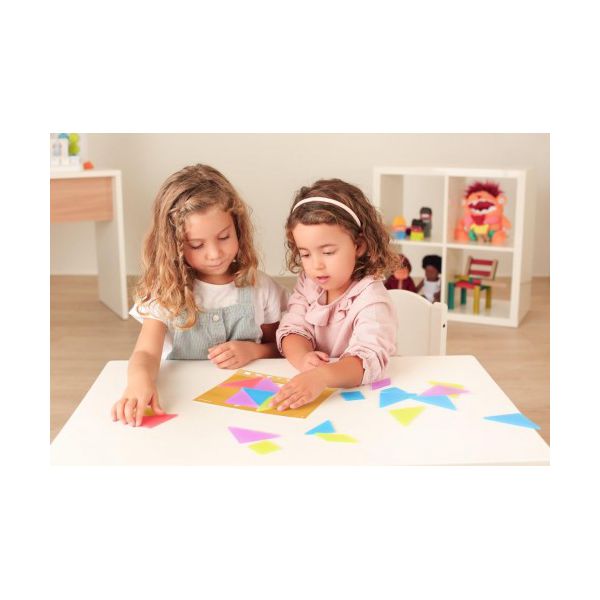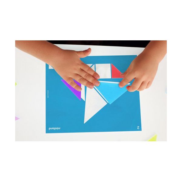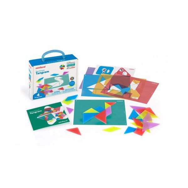 Conținut: Set de 4 tangramuri (28 buc), 6 cărți de joc transparente și 1 broșură