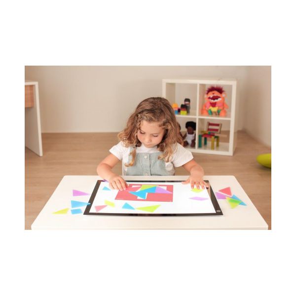 Piesele sunt realizate din material translucid, iar foile de activitate sunt transparente, astfel încât să poată fi utilizate ambele pe mesele de lumină Miniland