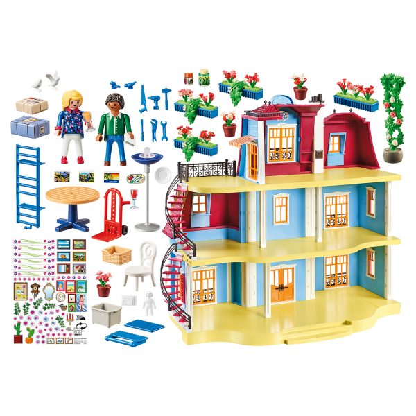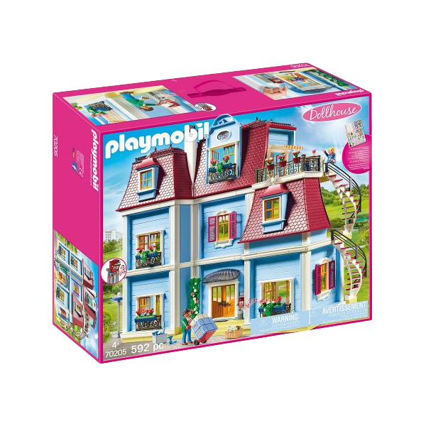 Casa mare de papusi de la PLAYMOBIL este plina de surprize si aventuri! Toti membrii familiei locuiesc aici si se simt bine unii cu altii. Toate camerele, de la parter si pana in pod, pot fi decorate asa cum iti doresti. Atunci cand musafirii sosesc, suna la soneria functionala (necestia 2 baterii de tip 1.5V), iar postasul plimbaret lasa in cutia de scrisori diferite plicuri. Dupa ce treburile casnice sunt gata, familia urca pe scarile spiralate pana pe teresa exterioara de la etaj, unde se relaxeaza in voie buna si liniste. Casa contine 6 camere spatioase. Aceasta poate fi combinata cu seturile 70206, 70207, 70208, 70209, 70210 si 70211. Setul include 2 figurine, o casa si multe alte accesorii. Varsta recomandata 4 ani+.
