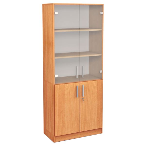 Dulap înalt cu vitrină în partea superioară și uși în partea inferioară.