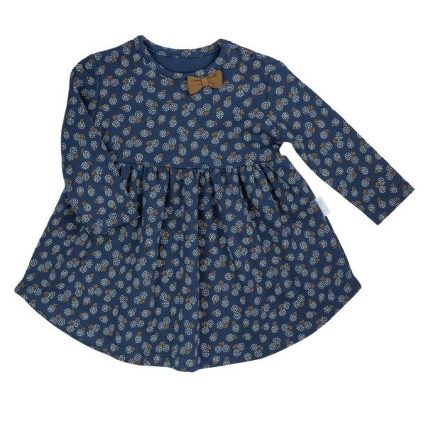 Rochita eleganta realizata din bumbac albastru cu motive florale. Banda elastica de la brau confera un aer copilaresc. Materialul este complet sigur pentru pielea copilului.\r