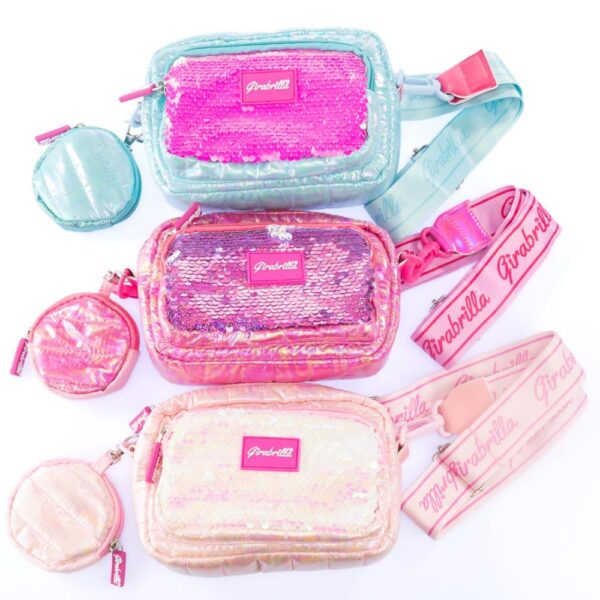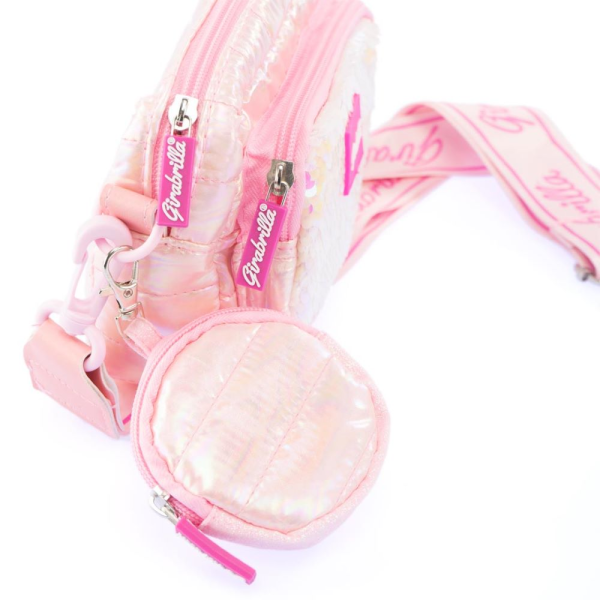 Pocheta moale din material puffer cu paiete reversibile. Curea reglabila si buzunar interior. Disponibila in mai multe culori. Accesoriu stralucitor pentru fetite de peste 5 ani.