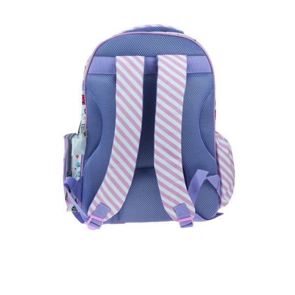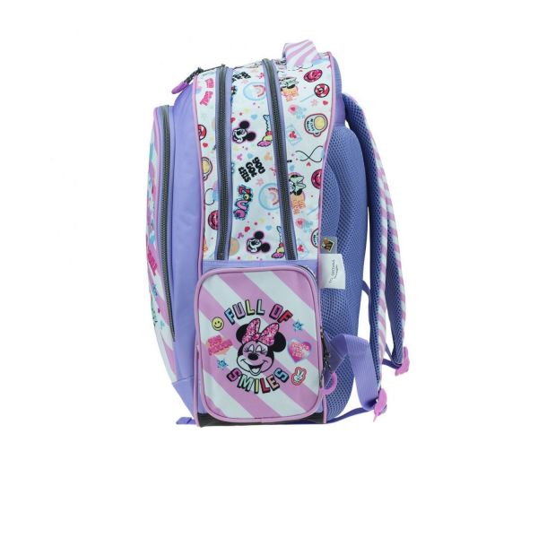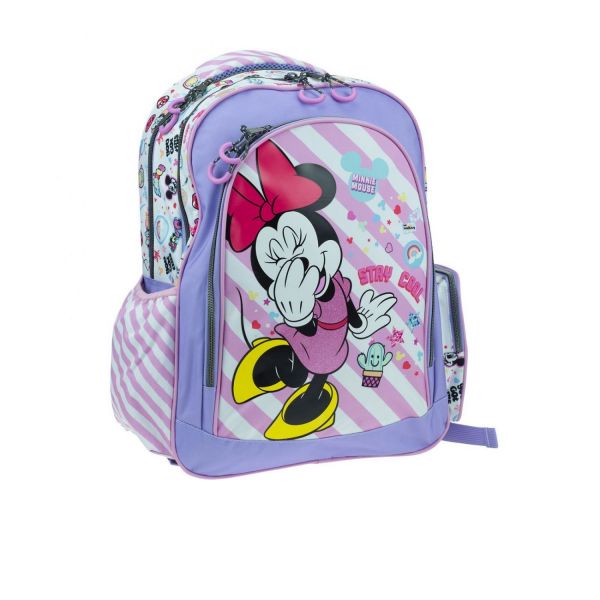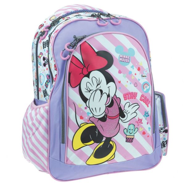 Ghiozdan Minnie pentru scoala, confectionat din poliester, cu 3 compartimente cu fermoar, buzunare laterale pentru sticla, maner si bretele ergonomice reglabile.