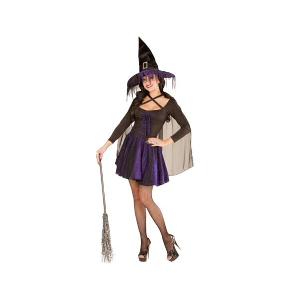 Costum Vrajitoare Purple include bluza, fusta, pelerina si palaria asortata.