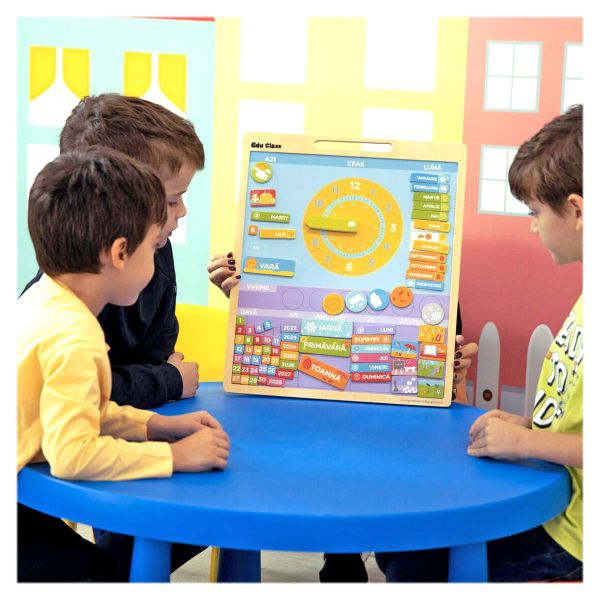 Un instrument educativ si distractiv, perfect pentru micii exploratori ai timpului! Calendarul magnetic BigJigs ii ajuta pe copii sa inteleaga mai bine vremea, anotimpurile, zilele saptamanii, lunile anului, precum si ora exacta, printr-un ceas colorat si usor de manevrat.