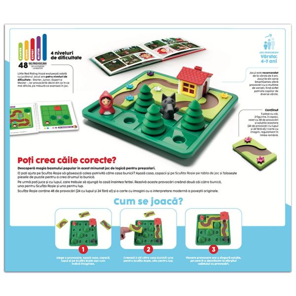 Little Red Riding Hood – Deluxe este un joc pentru copii din seria Smart Games, realizat cu elemente de inalta calitate si bazat pe celebra poveste a Scufitei Rosii. Jocul include 48 de provocari logice cu dificultati crescatoare, recomandat pentru varstele 4+. Provocarile ii invita pe copii sa construiasca trasee corecte pentru ca Scufita Rosie sa ajunga la casa bunicii. In primele jocuri, scopul este simplu: creezi o cale sigura pentru Scufita. In provocarile avansate apare Lupul, iar misiunea devine mai complexa, fiind necesara construirea a doua cai separate: una pentru Scufita Rosie si una pentru Lup, care nu trebuie sa ajunga primul. Jocul imbina perfect logica, povestea si joaca creativa.
