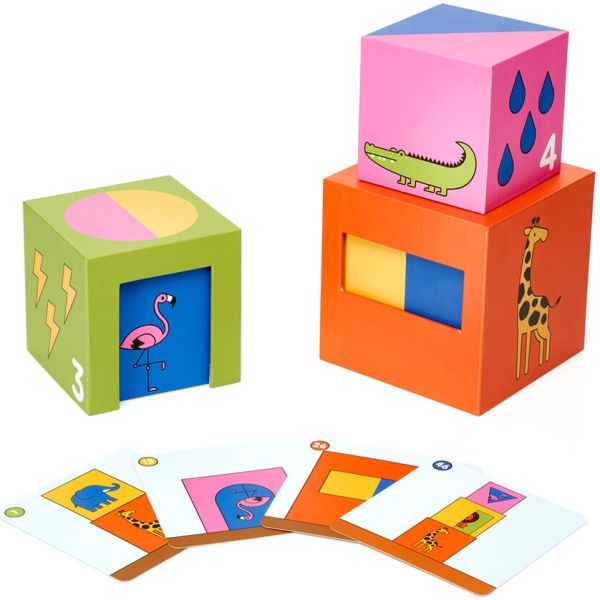 Continut pachet: Peek-a-Zoo (cuburi + capac + carti provocari)