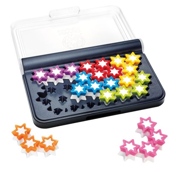 IQ Stars este un joc de logica compact si portabil din seria Smart Games, conceput pentru a testa si dezvolta abilitatile cognitive ale copiilor si adultilor. Setul vine intr-o cutie practica, cu capac transparent, si include 120 de provocari logice cu dificultati crescatoare, fiind recomandat pentru varstele 6+.