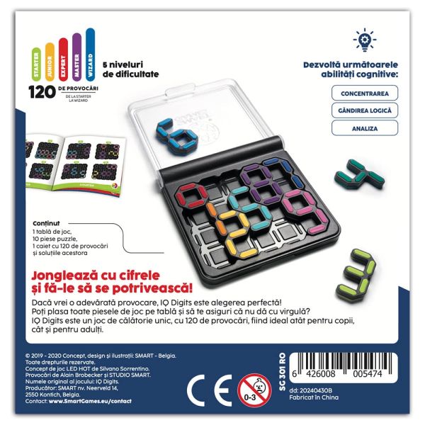 IQ Digits este un joc de logica compact si portabil din seria Smart Games, conceput pentru a testa si dezvolta abilitatile cognitive ale copiilor si adultilor. Jocul include 120 de provocari logice cu dificultati crescatoare, fiind recomandat pentru varstele 7+.
