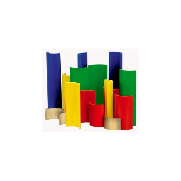 Piesele de 24 cm sunt albastr, cele de 20 cm sunt verzi, cele de 16 cm sunt galbene, cele de 12 cm sunt portocalii, cele de 8 cm sunt rosii iar cele de 4 cm sunt natur.