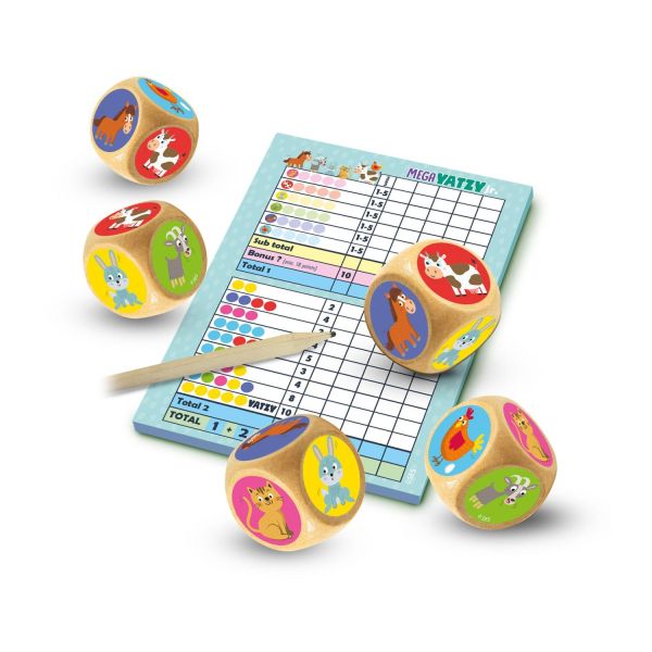Joc de petrecere pentru copii - Mega Yatzy Junior Joc de petrecere pentru copii - Mega Yatzy Junior - O editie pentru juniori a acestui binecunoscut joc de familie. Mega Yatzy Jr. este o editie pentru juniori cu zaruri de lemn foarte mari. Zarurile au ilustratii stralucitoare ale animalelor de ferma, fiecare cu o culoare diferita.