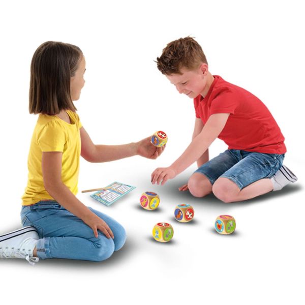 Contine: 5 zaruri din lemn cu imagini de animale (30 mm), bloc de scor (30 de pagini), instructiuni.