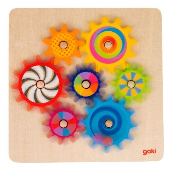 Asamblati rotile din lemn colorate pe tabla de joc. Cand roata albastra este rotita, iar toatepiesele sunt potrivite corespunzator, toate rotitele se vor invarti. Numar piese: 8