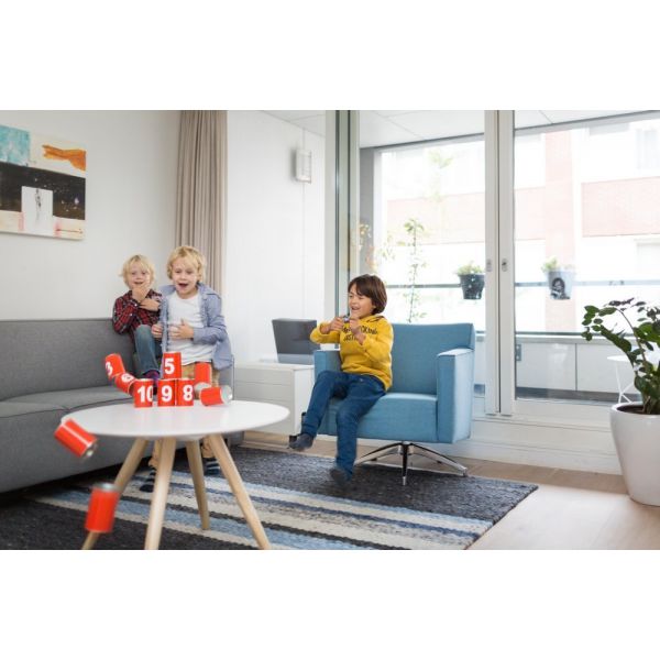 Jocul include 10 conserve din metal (inaltime 10 cm, diametru 6 cm) si 3 saculeti cu granule.
