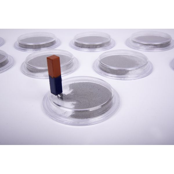 Recipiente umplute cu pilitura magnetica, folosite pentru experimentare diferitelor proprietati magnetice.