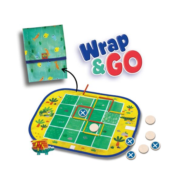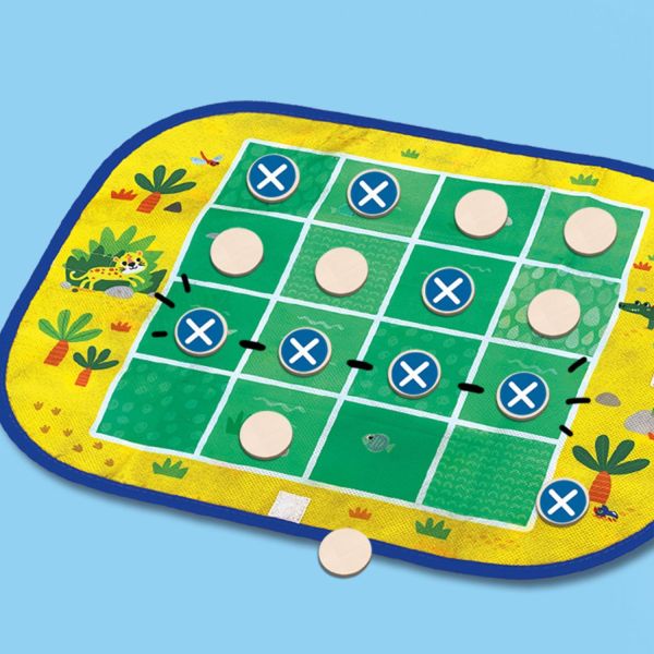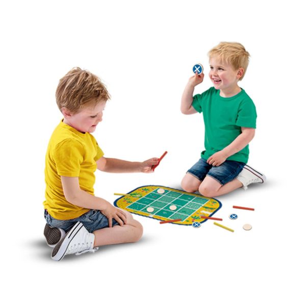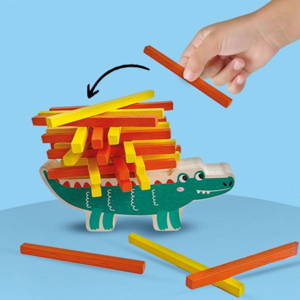 Contine: tabla de joc textila (poate fi pliata intr-o geanta compacta de depozitare), 16 piese de joc din lemn, imprimate, crocodil de stivuire din lemn, 40 de bete de lemn in doua culori, instructiuni.