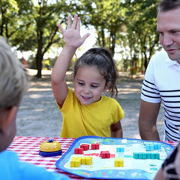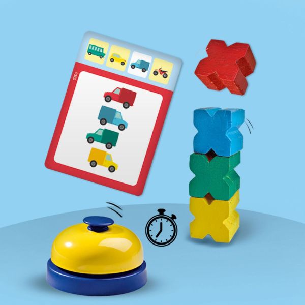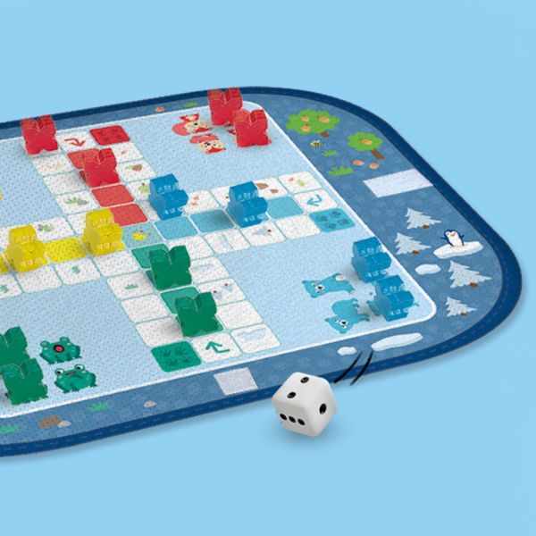 Contine: tabla de joc textila (poate fi pliata intr-o geanta compacta de depozitare), 16 pioni din lemn in 4 culori, zaruri, clopot de hotel metalic, 32 de carti de blocuri Quartet/Speed, instructiuni.
