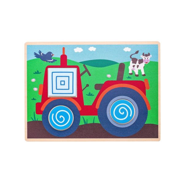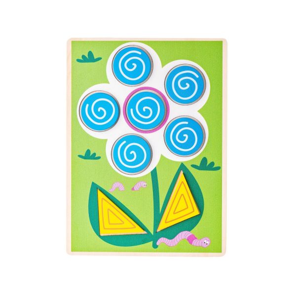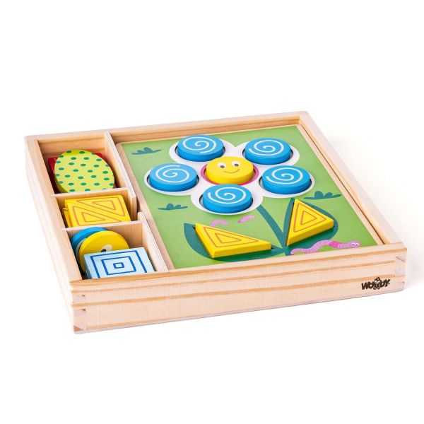 Cutia din lemn contine 10 placi de imagine. Fiecare placa are decupaje sub forma de forme geometrice. Copilul pune in imagine formele corespunzatoare si astfel dezvolta logica si combinatia subtila.
