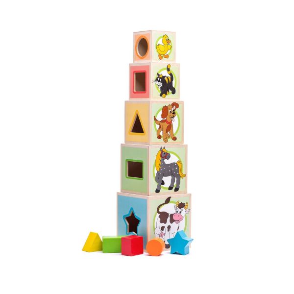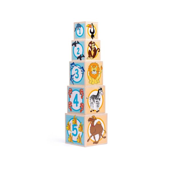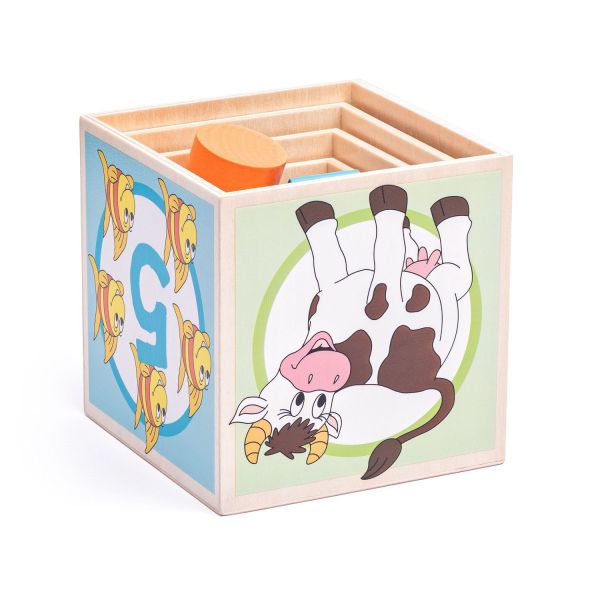 Cuburile pot fi stivuite una peste alta si una peste alta si au mai multe functii. Fiecare cub contine o deschidere in care se introduce un cub cu forma si culoarea corespunzatoare. Pe ceilalti pereti exista imagini cu numarul de animale si corespunde numarului si pe partea laterala a cubului.