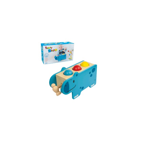 Setul include: 1 banc de lemn in forma de hipopotam, 3 bile din lemn, 1 ciocan