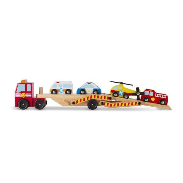 Transportor cu vehicule de urgenta Melissa and Doug Aceasta remorca gigantică pe doua nivele este dotata cu patru vehicule de urgenta din lemn si ofera posibilitati de joc nelimitate. Coborati puntea superioara pentru a extinde camionul la o lungime de aproape 60 cm si pentru a permite vehiculelor sa se indrepte spre salvare. Sunt incluse in set un elicopter, o masina de pompieri, o masina de politie si o ambulanta, construite din lemn masiv de ce mai buna calitate, pictate cu vopsea non-toxica in culori primare. Jucariile sunt ideale pentru dezvoltarea miscarilor fine, a coordonarii ochi-mana, dezvoltarea imaginatiei si a creativitatii. Dimensiuni ambalaj: 35 x 17 x 8.5 cm