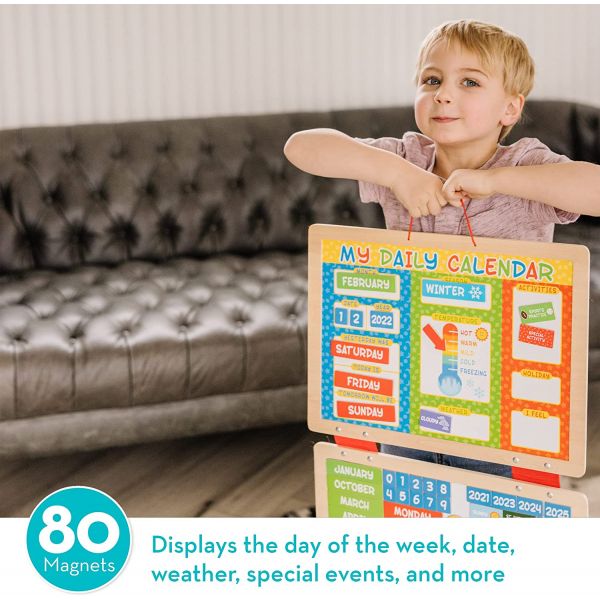 Calendarul zilnic magnetic Melissa & Doug include zilele saptamanii, data, vremea si evenimentele speciale; vine insotit de 80 de magneti, care includ ani, luni, zile ale saptamanii, sarbatori, emotii si multe altele.